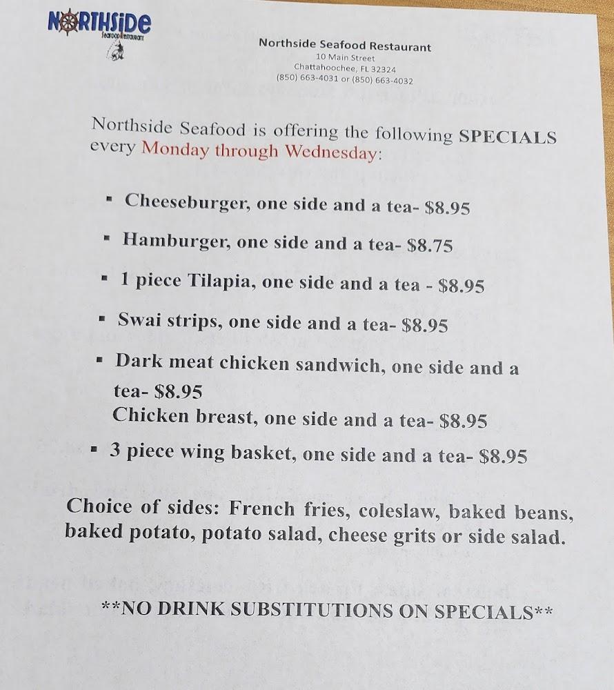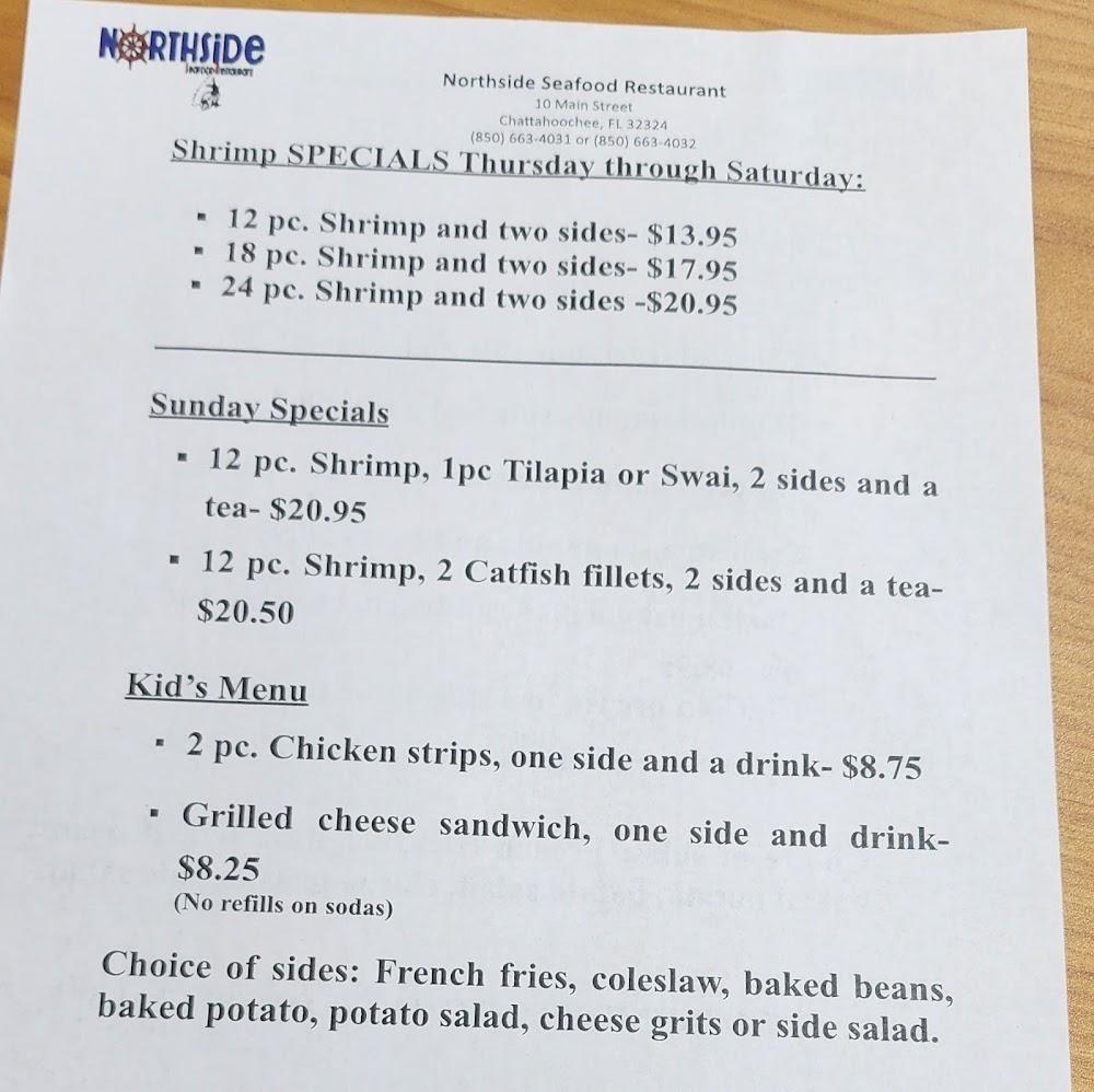 Welcome to Northside Seafood, your go-to destination in Chattahoochee for fresh and flavorful seafood! Nestled at 10 Main St, our welcoming restaurant offers a casual atmosphere perfect for solo diners, families, and groups. Enjoy a wide selection of local specialties, including our famous fried shrimp and hushpuppies. With options for dine-in, takeout, and delivery, we cater to all dining preferences. Our accessible facilities ensure everyone can join in the culinary experience. Stop by for a delightful lunch or dinner, and don’t forget to explore our delicious desserts and kids' menu. Come taste the best of coastal cuisine!