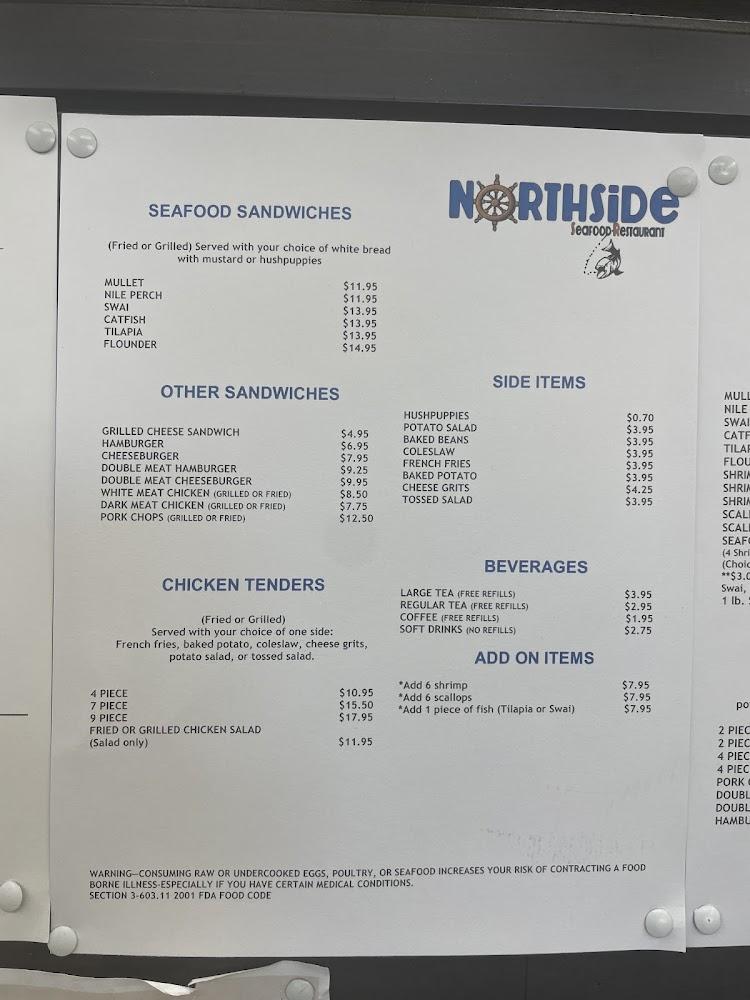 The menu at Northside Seafood focuses primarily on seafood, featuring delectable options like catfish, tilapia, and shrimp. Diners can choose from fried or grilled preparations, ensuring there's something for every taste. Sandwiches add variety, with choices like hamburgers and fried seafood.